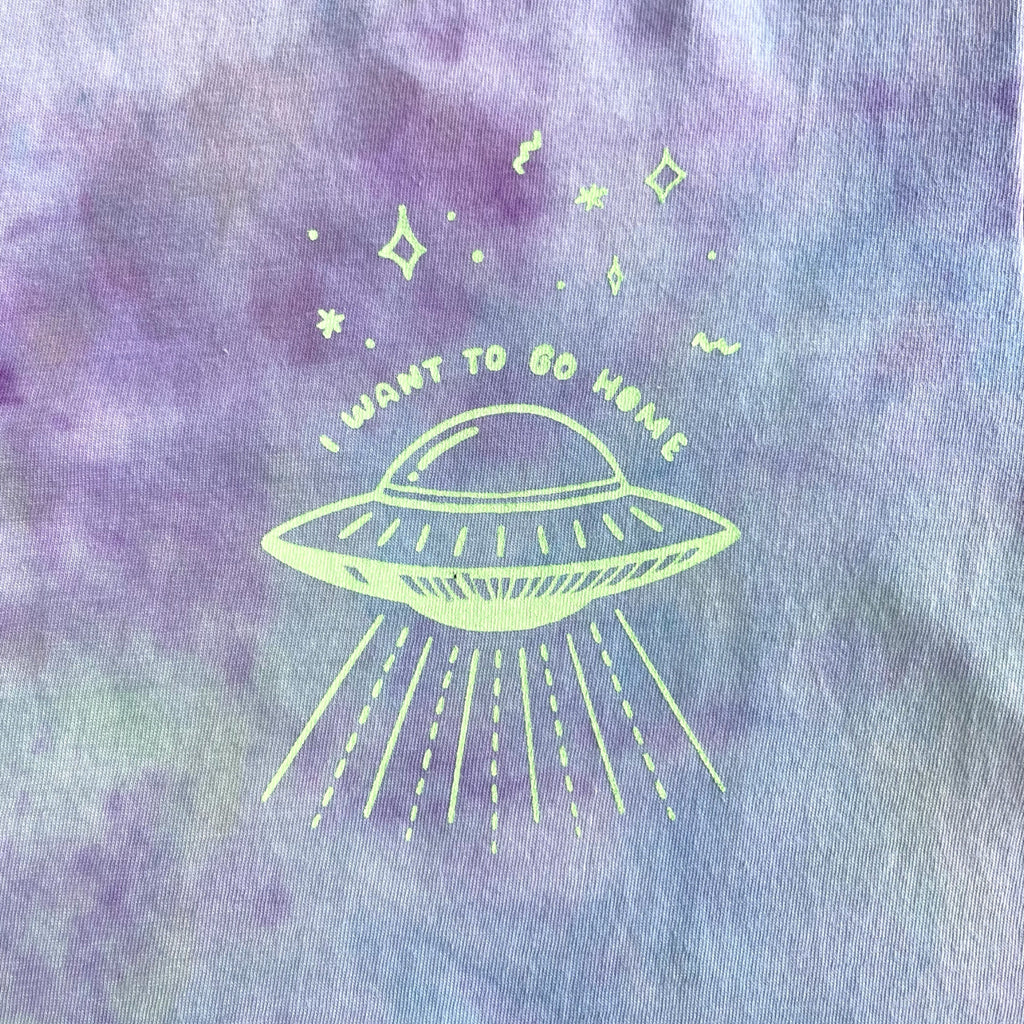 "I want to go home." Did the alien take one look at our Earth and immediately want to go back home? Or is Earth home? Are *we* the aliens? This shirt is for homebodies and aliens alike.